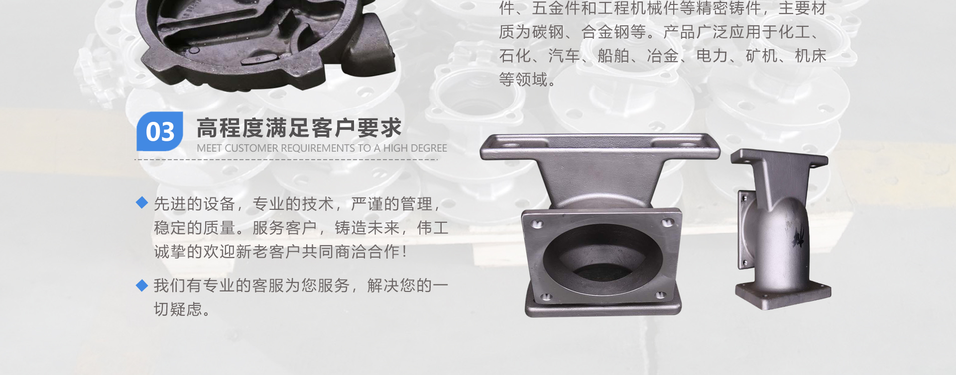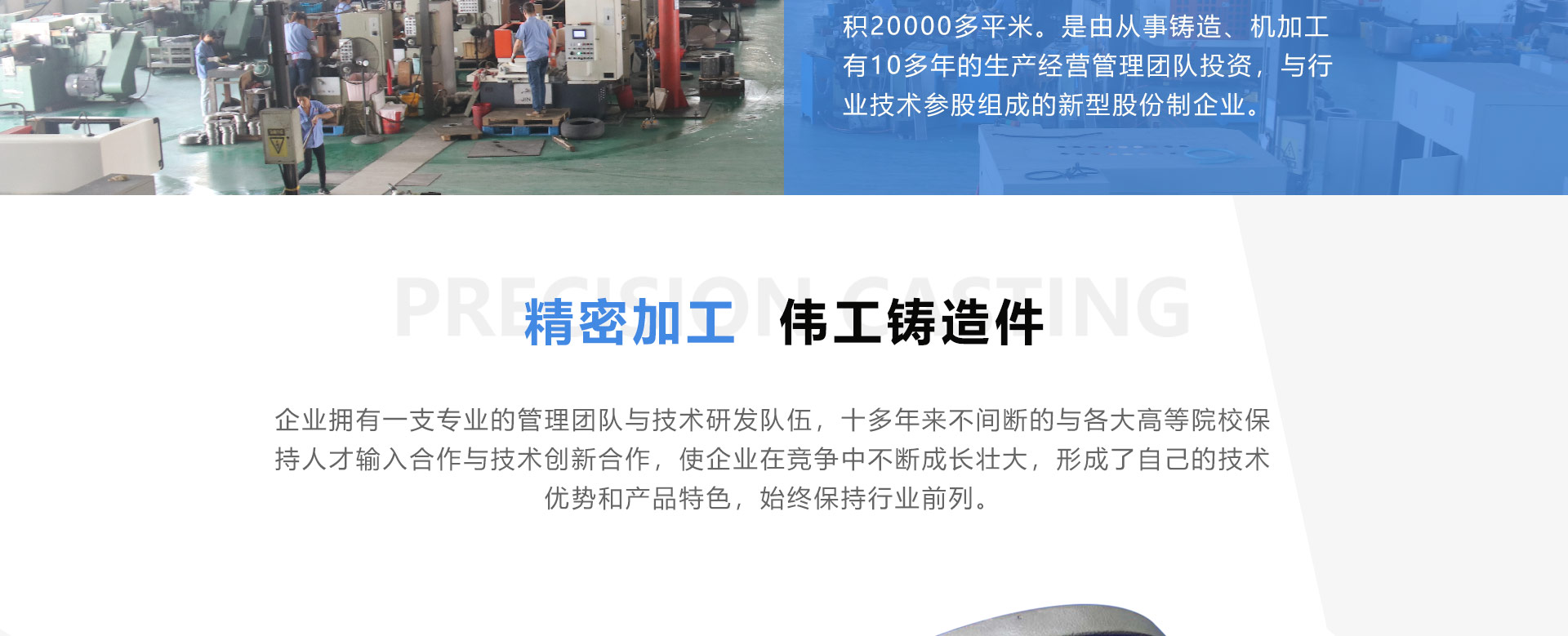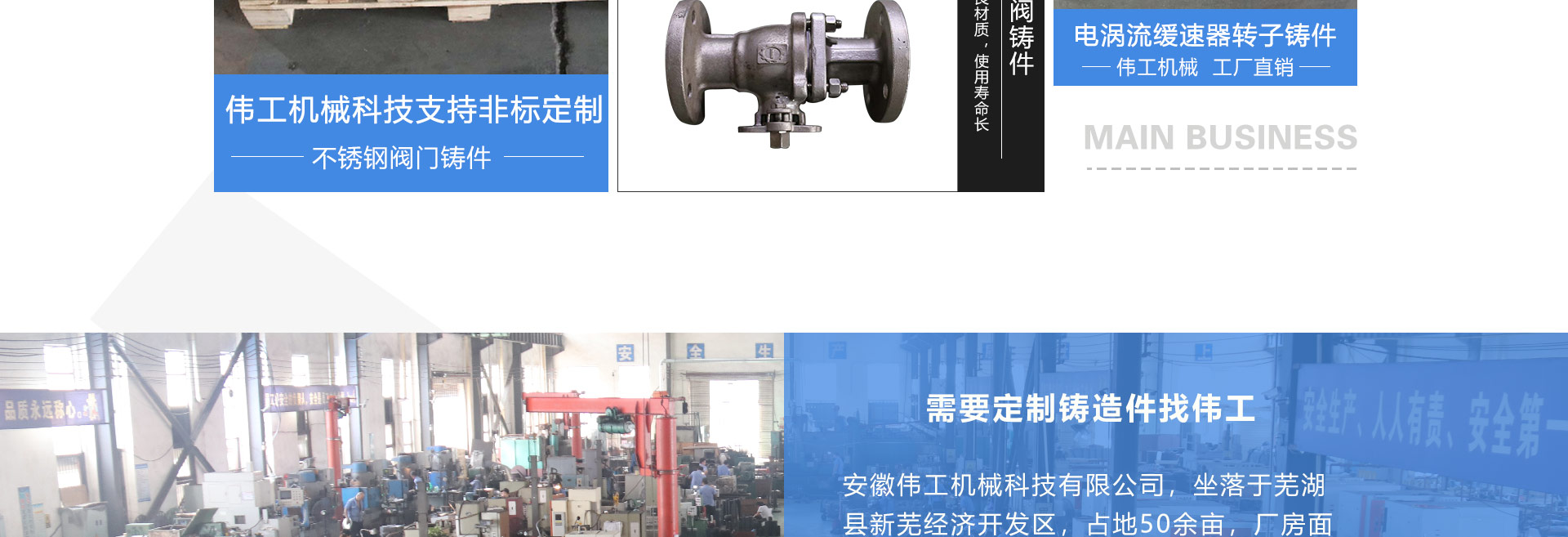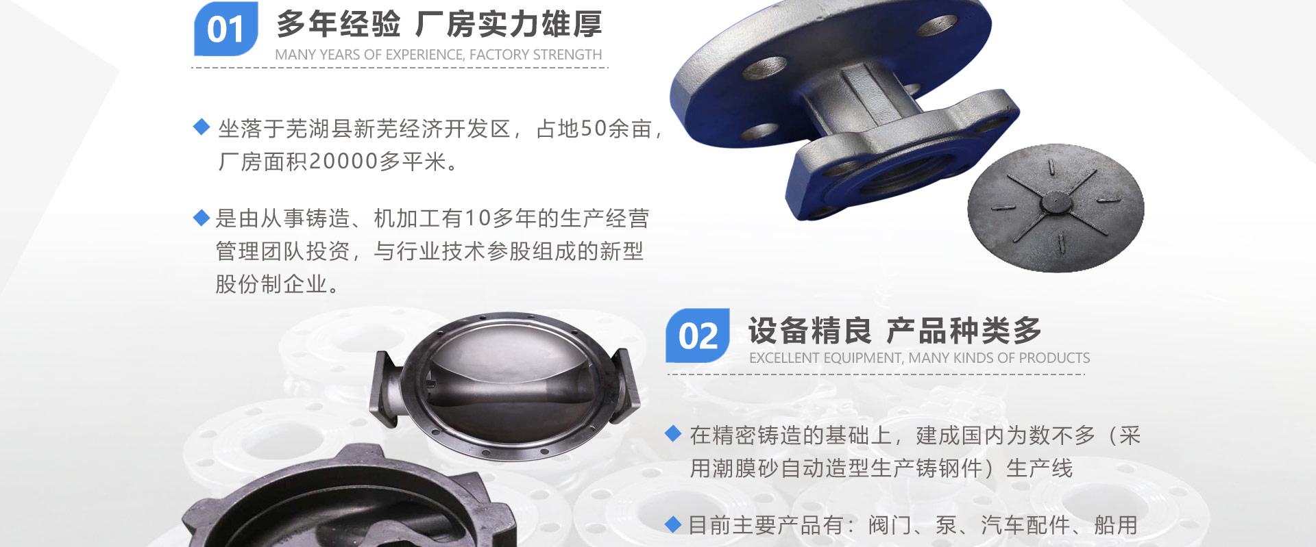 安徽偉工機械科技有限公司,坐落于安徽蕪湖新蕪經(jīng)濟開發(fā)區(qū),是一家専業(yè)從事鑄造產(chǎn)品設(shè)計、研發(fā)、生產(chǎn)、銷售于一體的企業(yè),公司為客戶的產(chǎn)品提供多樣的技術(shù)支持與設(shè)計,公司主要鑄造技術(shù)有潮模砂鑄造、硅溶膠精鑄工藝。主要產(chǎn)品有:不銹鋼閥門配件、泵閥配件、汽車配件、工業(yè)管道配件、工程機械配件、汽車配件等。材質(zhì)為:低合金鋼、304、316、316L、鉻鉬鋼、哈氏合金、碳鋼、雙相鋼等。公司已先后通過ISO9001和TS16949等多種體系審核,以完備的管理手段和齊全的檢測設(shè)備滿足客戶需求,進的設(shè)備,専業(yè)的技術(shù),嚴(yán)謹(jǐn)?shù)墓芾恚€(wěn)定的質(zhì)量。服務(wù)客戶,鑄造未來,偉工誠摯的歡迎新老客戶共同商洽合作
